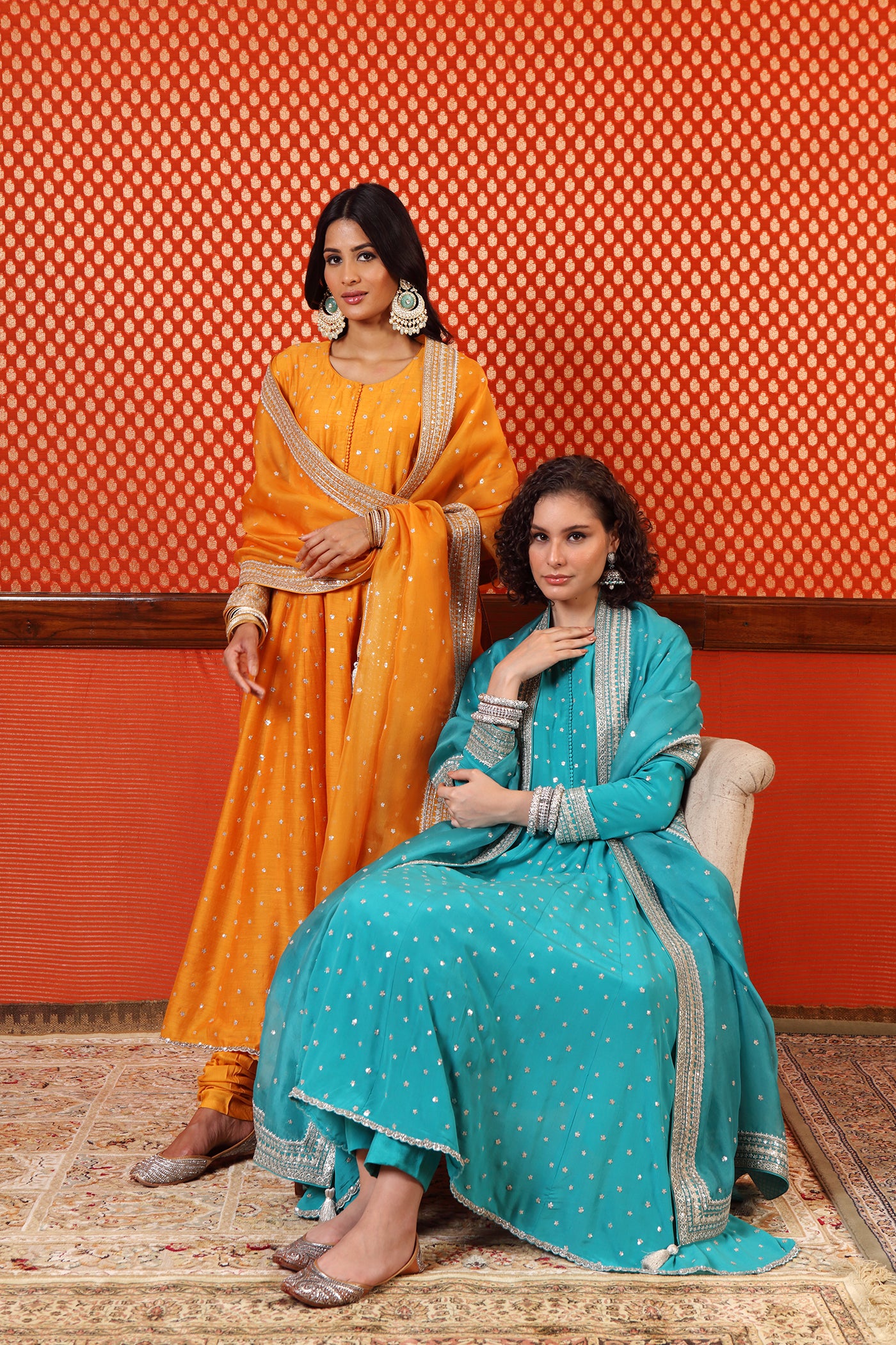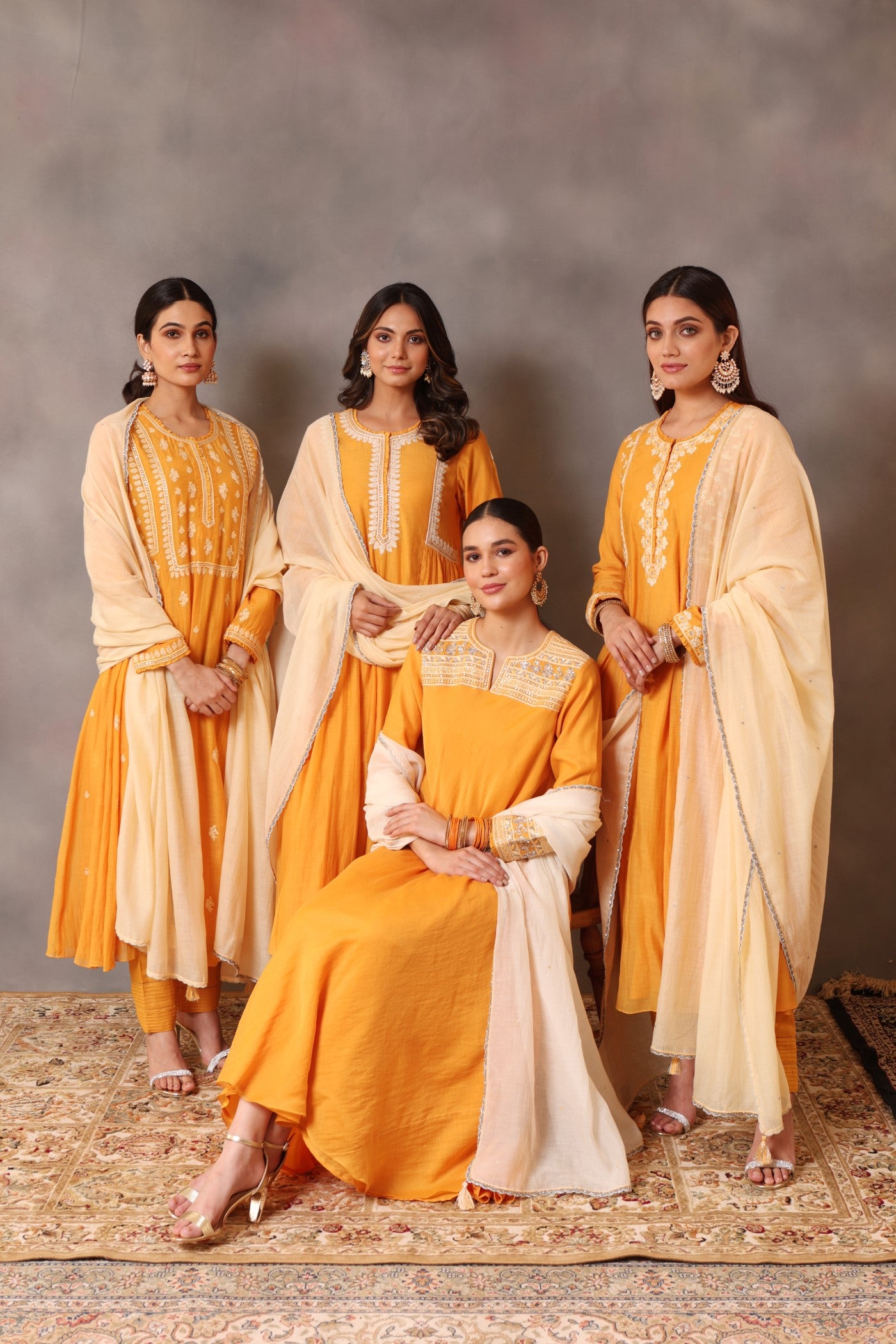 Hand Embroidered Mango Yellow Pure Muga Silk Anarkali Churidaar Set