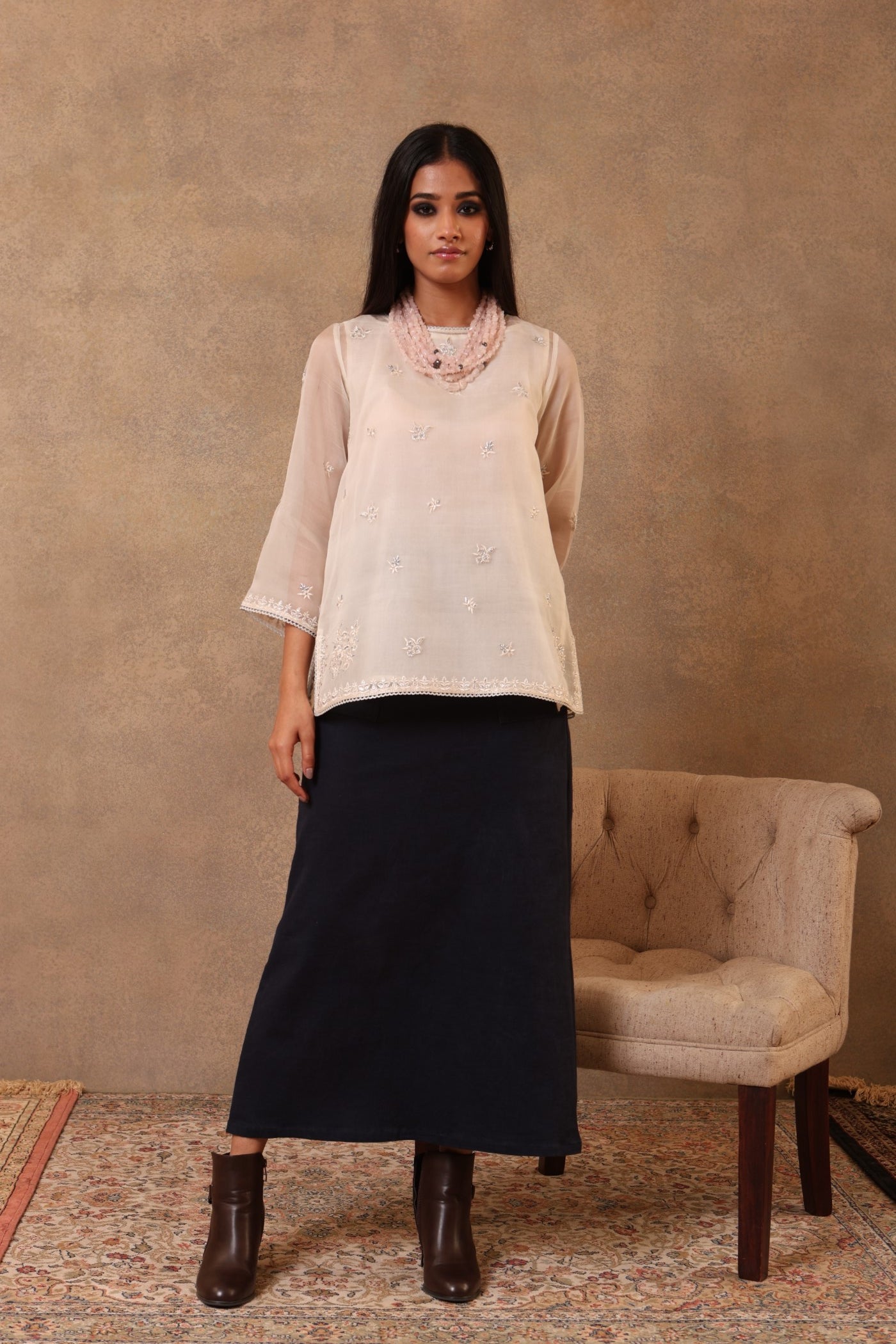 This is a sleeveless long dress made from hand-woven pure mulberry-eri silk in two different colours. The fabric has been woven on traditional handloom with hand-dyed yarns. The dress has been lined with pure cotton for comfort and has a key-hole shaped back-opening.